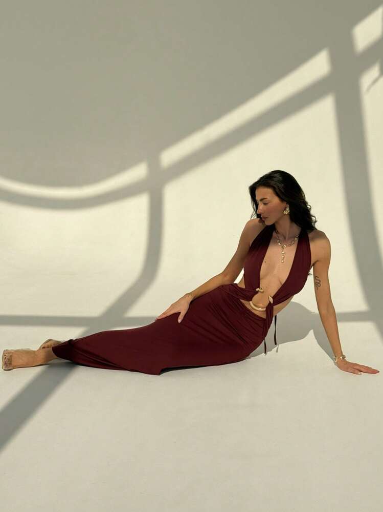 This dress embodies fierce femininity and unapologetic confidence. The deep V-neckline and halter design create a look that's both sophisticated and seductive. Perfect for making memorable entrances at exclusive parties, rooftop events, or glamorous nights out.